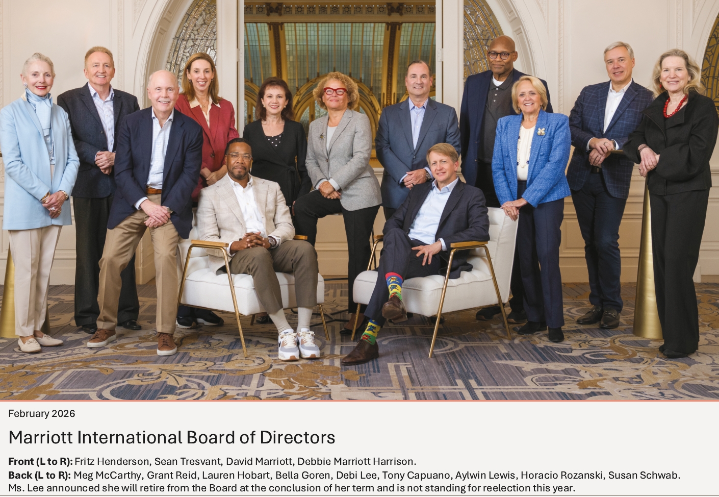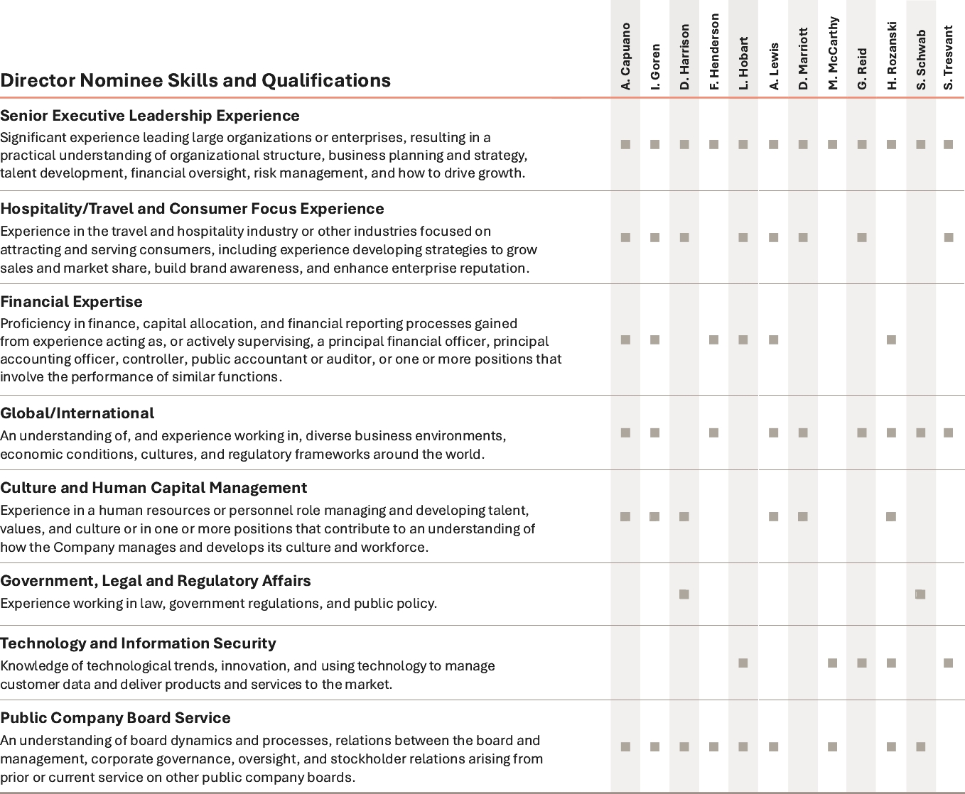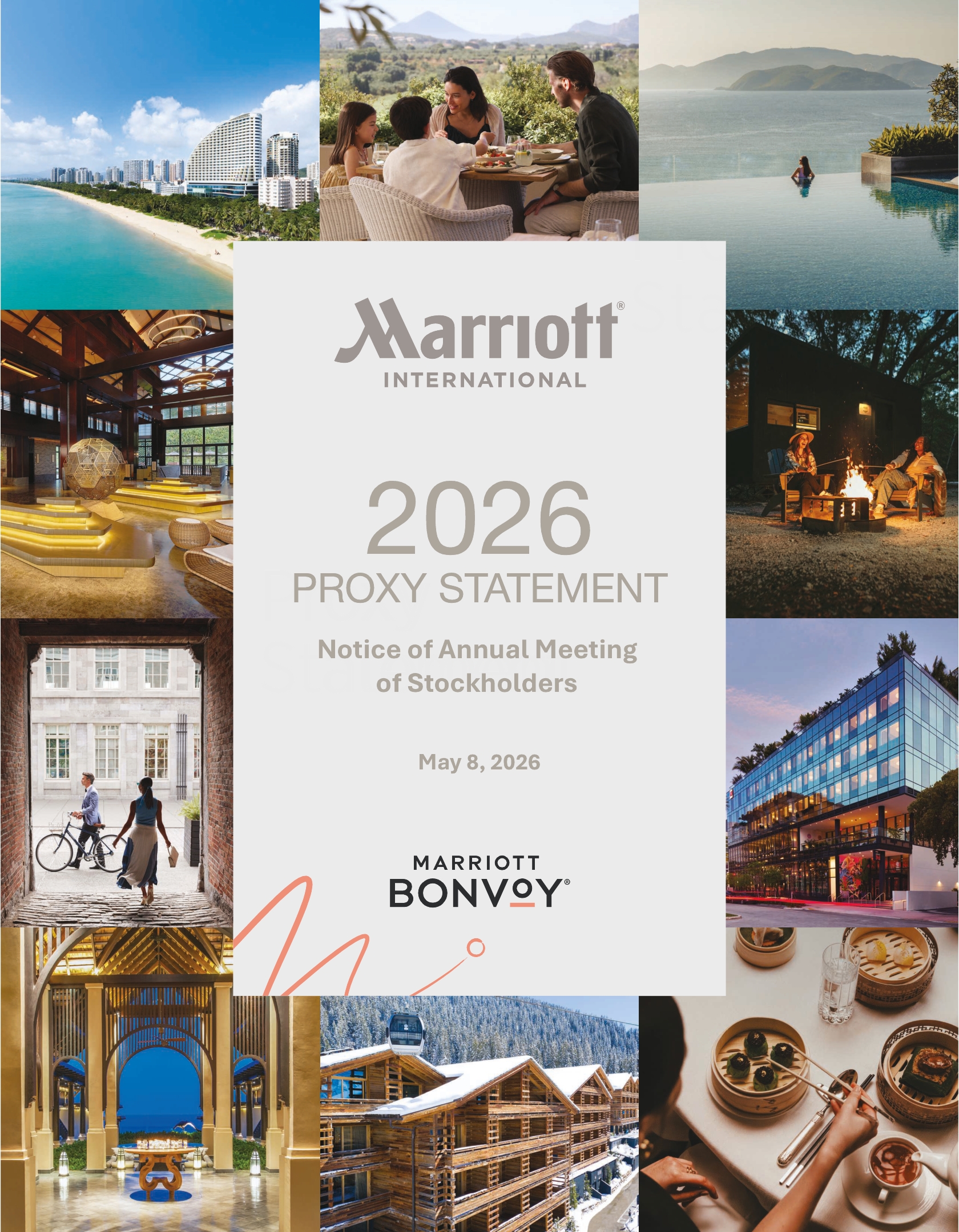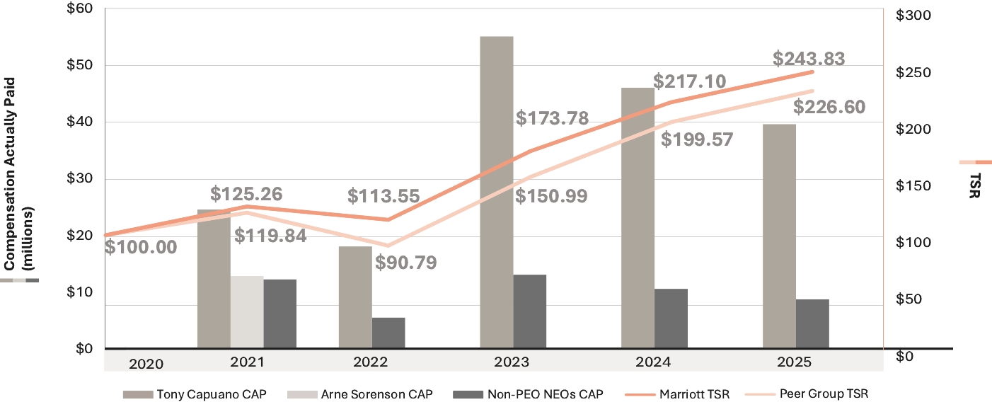 Our Company was founded by Mr. J.W. Marriott, Jr.’s parents, and the Board believes that the continued involvement of Marriott family members in responsible positions of the Company makes a significant long-term contribution to the value of our corporate name and identity and to the maintenance of our reputation for providing quality products and services, reinforces the culture and core values that are the bedrock of our success, and promotes associate engagement and retention. In addition to Mr. David S. Marriott’s membership on the Board and role as Chairman of the Board and Mrs. Harrison’s membership on the Board and role as Global Cultural Ambassador Emeritus, the Company employs (or employed in 2025) other members of the Marriott family. From time to time, the Company may also employ family members of other directors or executive officers. The compensation levels of such family members are set based on reference to external market practice for similar positions and/or internal pay equity when compared to the compensation paid to non-family members in similar positions. Employed family members with total compensation for 2025 in excess of $120,000, which includes, to the extent applicable, base salary, bonus, the value of stock-based awards, and all other compensation, were Jennifer Decker Brown, Mr. Brown’s former daughter-in-law, whose total 2025 compensation was $131,517 for her service as Manager, HR Technology; and Matthew Harrison, Mrs. Harrison’s son and Mr. David S. Marriott’s nephew, whose total 2025 compensation was $266,407 for his service as a hotel general manager. No other employed family members’ total compensation for 2025 exceeded $120,000.
