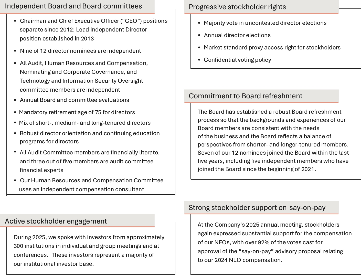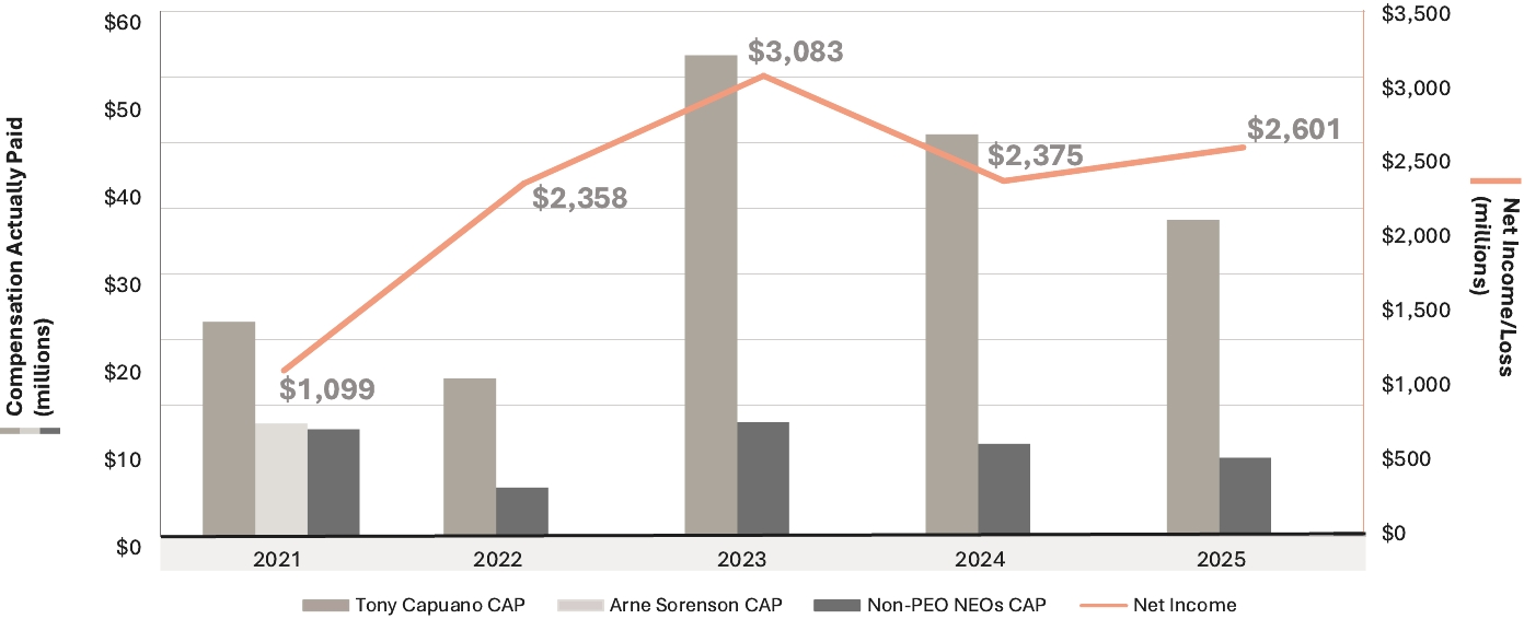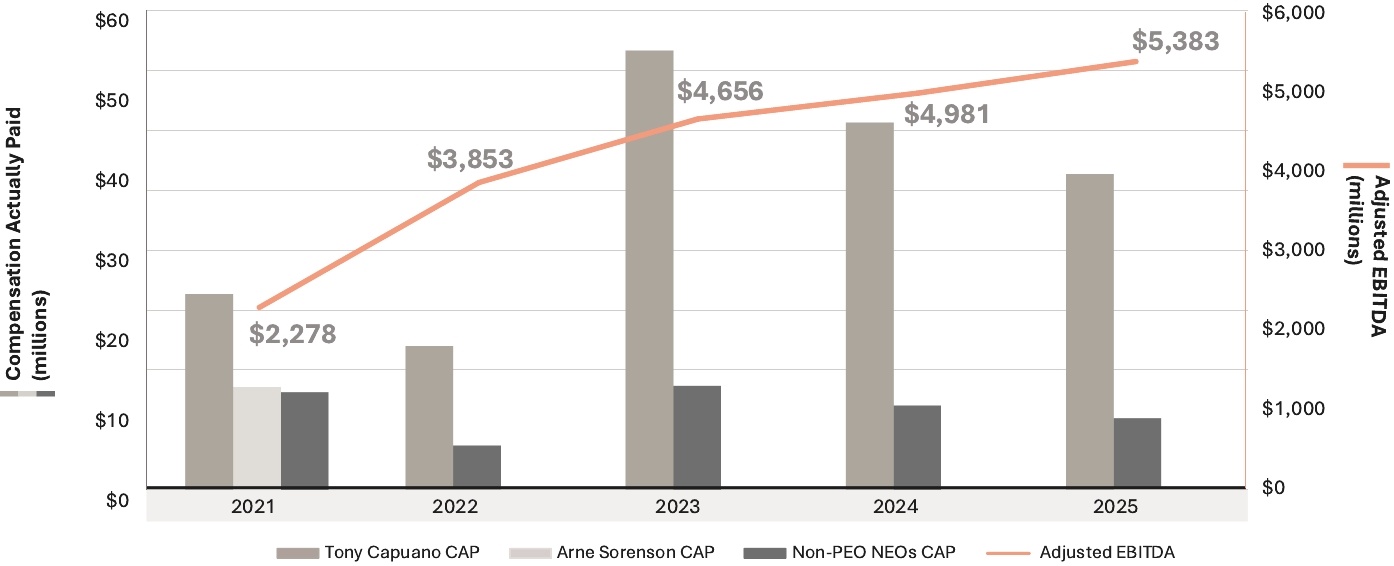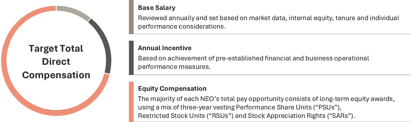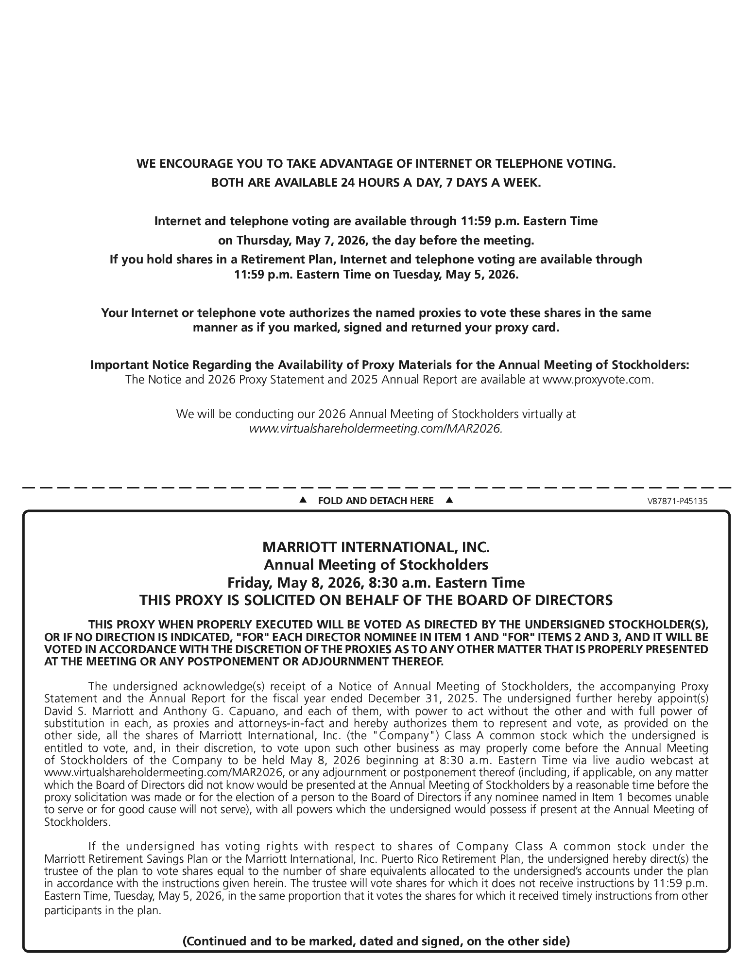 Our Company was founded by Mr. J.W. Marriott, Jr.’s parents, and the Board believes that the continued involvement of Marriott family members in responsible positions of the Company makes a significant long-term contribution to the value of our corporate name and identity and to the maintenance of our reputation for providing quality products and services, reinforces the culture and core values that are the bedrock of our success, and promotes associate engagement and retention. In addition to Mr. David S. Marriott’s membership on the Board and role as Chairman of the Board and Mrs. Harrison’s membership on the Board and role as Global Cultural Ambassador Emeritus, the Company employs (or employed in 2025) other members of the Marriott family. From time to time, the Company may also employ family members of other directors or executive officers. The compensation levels of such family members are set based on reference to external market practice for similar positions and/or internal pay equity when compared to the compensation paid to non-family members in similar positions. Employed family members with total compensation for 2025 in excess of $120,000, which includes, to the extent applicable, base salary, bonus, the value of stock-based awards, and all other compensation, were Jennifer Decker Brown, Mr. Brown’s former daughter-in-law, whose total 2025 compensation was $131,517 for her service as Manager, HR Technology; and Matthew Harrison, Mrs. Harrison’s son and Mr. David S. Marriott’s nephew, whose total 2025 compensation was $266,407 for his service as a hotel general manager. No other employed family members’ total compensation for 2025 exceeded $120,000.